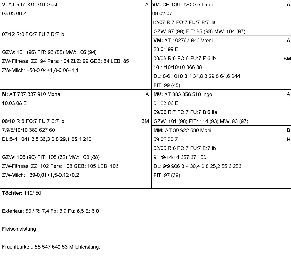 | Anzahl | Lakt. Nr. | Melktage | Milch kg | Fett % | Fett kg | Eiw. % | Eiw. kg |