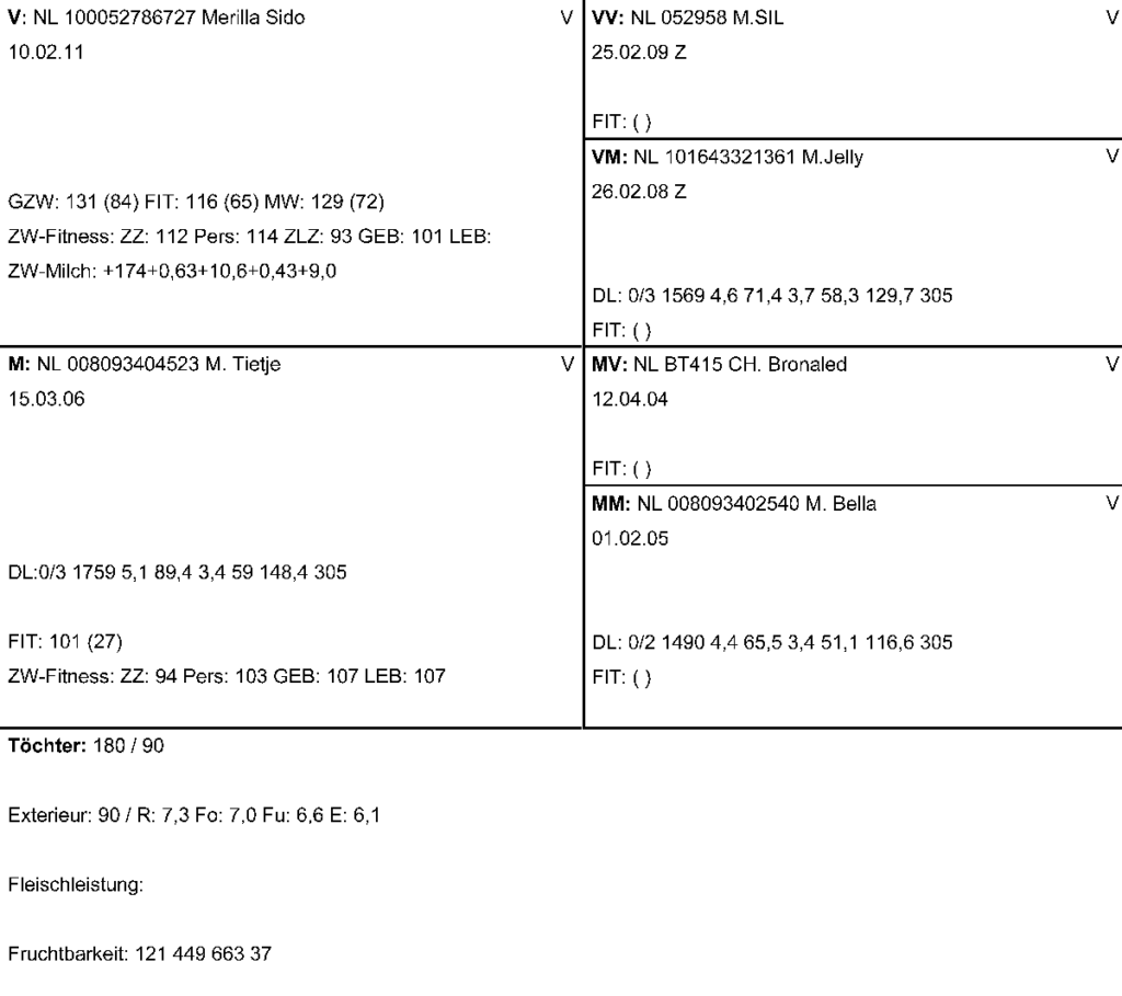 | Anzahl | Lakt. Nr. | Melktage | Milch kg | Fett % | Fett kg | Eiw. % | Eiw. kg |