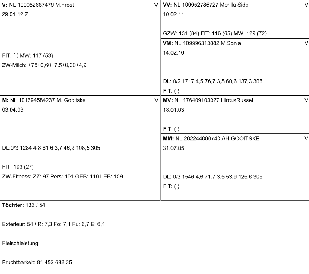| Anzahl | Lakt. Nr. | Melktage | Milch kg | Fett % | Fett kg | Eiw. % | Eiw. kg |