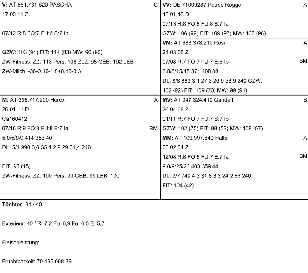 | Anzahl | Lakt. Nr. | Melktage | Milch kg | Fett % | Fett kg | Eiw. % | Eiw. kg |